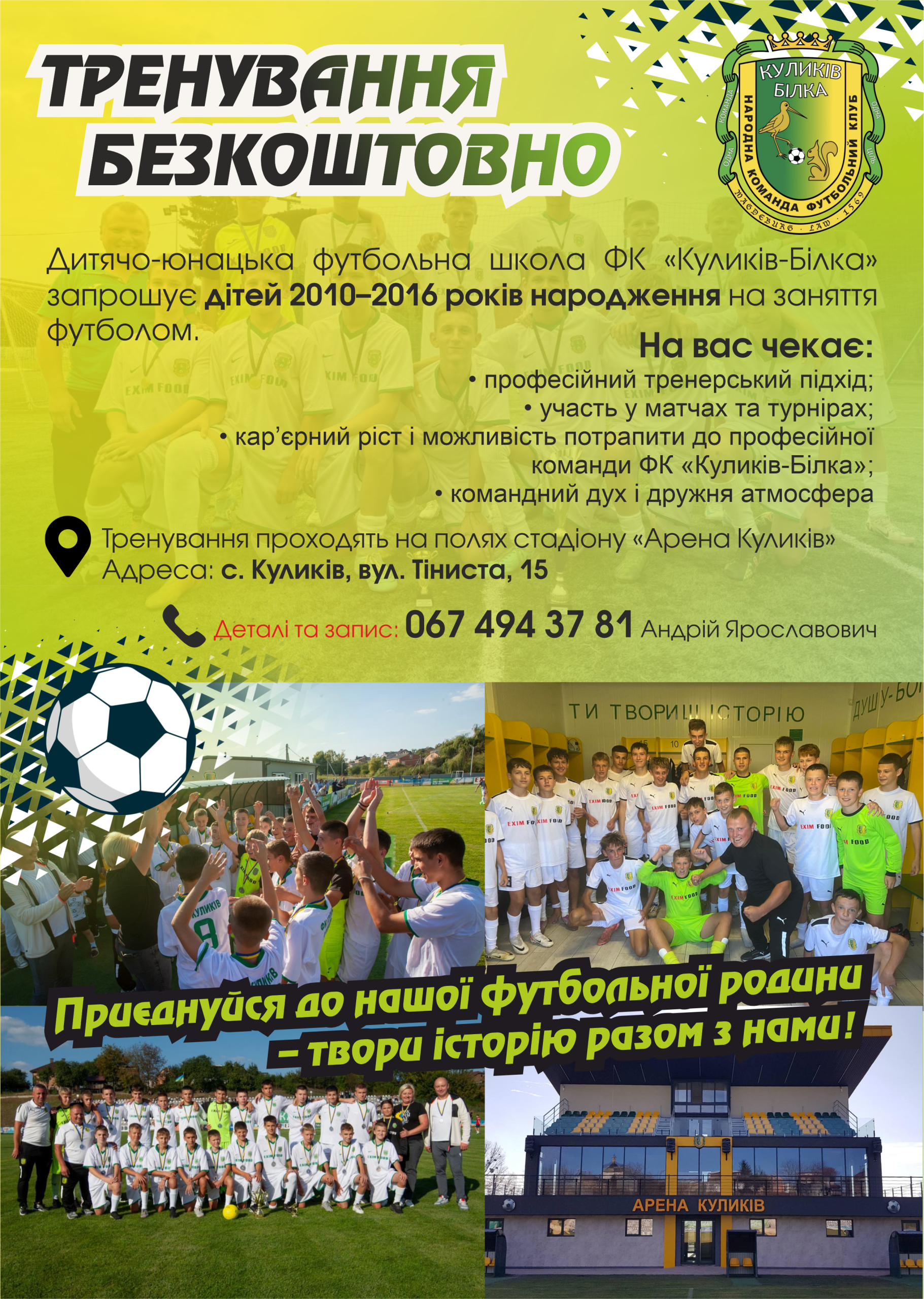 Дитячо-юнацька футбольна школа ФК “Куликів-Білка” запрошує до занять футболом дітей 2010 – 2016 років народження.