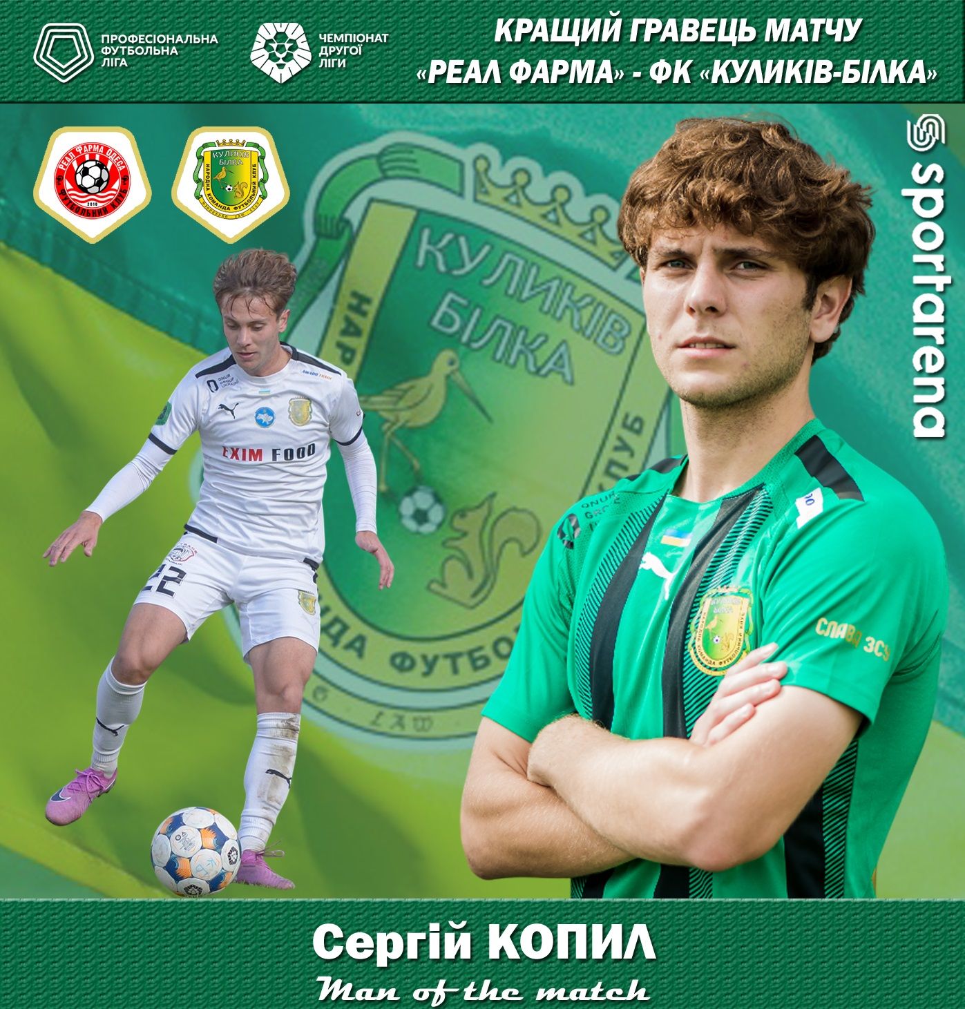По завершенні матчів чемпіонату України серед команд клубів другої ліги інформаційний партнер змагань ПФЛ портал «Sportarena» традиційно визначає кращого гравця кожного матчу. «Man of the match» за підсумками поєдинку «Реал Фарма» Одеса – ФК «Куликів-Білка» визнаний півзахисник нашої команди Сергій КОПИЛ. «Командна перемога лідера, кого хочеш – називай, вся команда відіграла рівно. Хай буде центрхав…